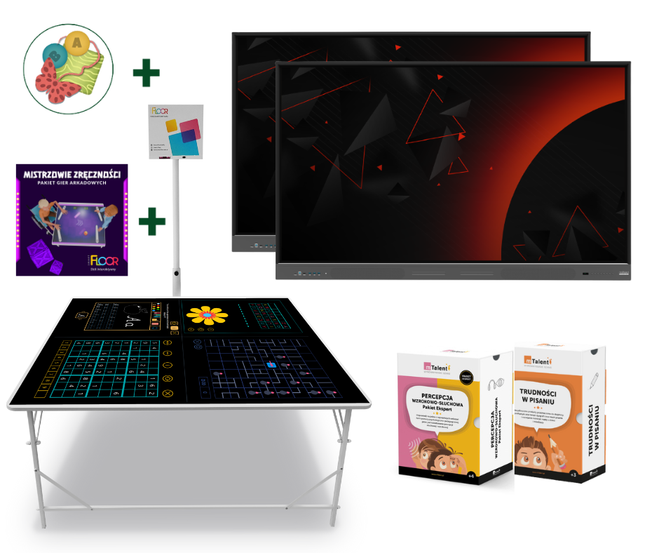 Rewolucja na polskim rynku podłóg interaktywnych! Połączenie podłogi interaktywnej SmartFloor z dedykowanym stołem oraz kolekcją 12 gier sterowanych dłońmi. Dzięki wykorzystaniu projekcji na stole otrzymujemy dostęp do zupełnie nowego rodzaju interakcji – dłoni. Intuicyjne sterowanie i wciągający interfejs sprawiają, że forma zabawy jest dostępna dla wszystkich grup wiekowych, a specjalnie zaprojektowany stół umożliwia dostępność dla osób z niepełnosprawnościami ruchowymi. Zestaw posiada statyw mobilny z głośnikami, pozwalający na jeszcze lepsze wrażenia z zabawy i nauki.